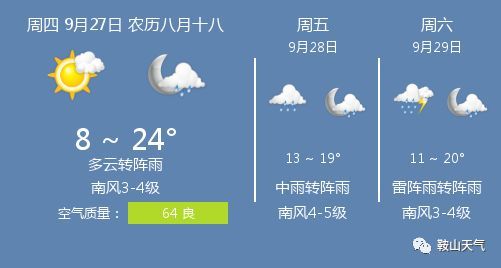 鞍山市天气预报- 答:鞍山市天气预报 13日 星期三 白天 晴 高温 31℃ 南风 3-4级 夜间 多云 低温 23℃ 南风 3-4级 14日 星期四 白天 多云 高温 30℃ 南风 3-4级 夜间 多云 低温 23℃ 南风 3-4级