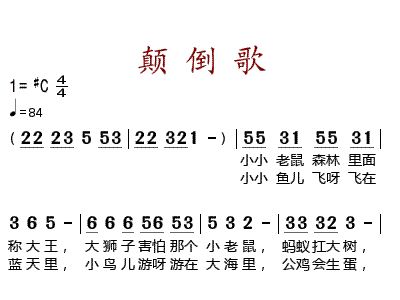 颠倒歌》歌词小小老鼠树林里面称大王,大狮子害怕那个小老鼠,蚂蚁扛大树,大象没力气,事情全颠倒,哈哈!你说多可笑。 小小鱼儿飞呀飞在蓝天里,小鸟儿游啊游在大海里,公鸡会生蛋,母鸡喔喔啼,事情全颠倒,哈哈!你说多可笑。打起喇叭吹起锣, 听我唱支颠倒歌-- 黑夜做了个白日梦, 梦见个小孩胡子多。 书本