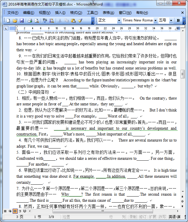 求高考英语万能作文模版,最好带翻译。(句子也可以)
