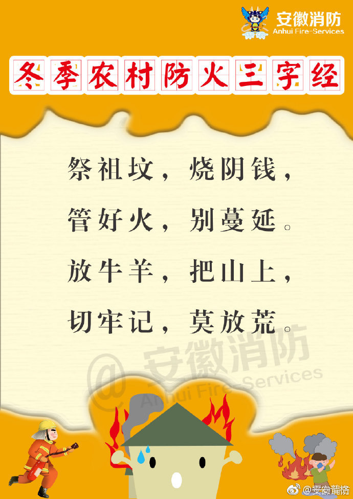 消防温馨提醒防火三字经:生活中火看严危险物不近前燃气漏阀门关开门窗禁火电电线老快修换保险丝用专件铜铁代不保险火灾来快疏散钱财物别贪