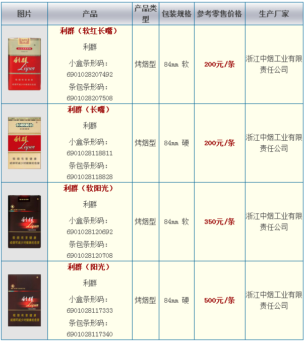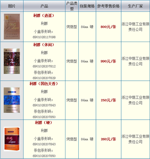 利群烟价格表查询 ,利群烟价格表一览:图片产品产品类型包装规格参考零售价格生产厂家利群(逍遥)利群小盒条形码:6901028117098烤烟型 84mm硬 8