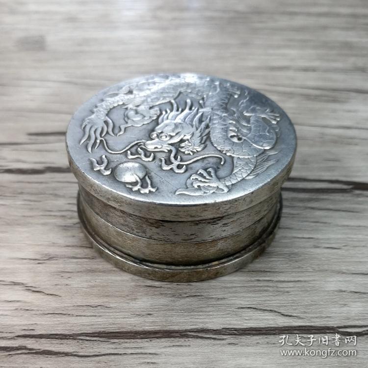 古玩铜器收藏 白铜墨盒 双龙戏珠镶嵌银元