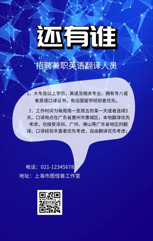 英语兼职翻译的要求是什么?- 答:你可以去一些翻译公司和旅游公司问一下,他们会给你提出明确的要求。你的经验他们会考虑的。直接去问吧,还有工作机会。从网上问没有实际意义。