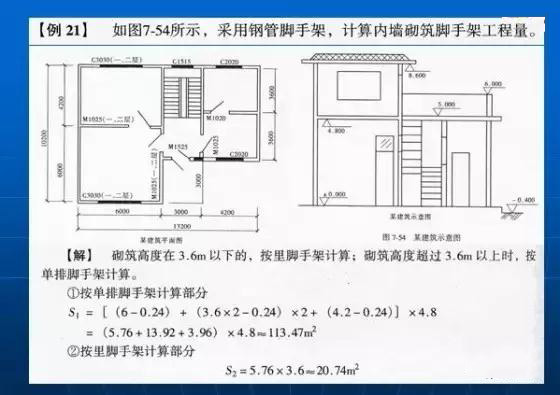 脚手架计算规则分享 a)平面图b)柱【解】(1)柱脚手架工程量:每根柱的脚手架工程量=(柱断面周长+3.6m)×柱高=[(0.5+0.3)×2+3.6](4.45+0.38+0.12)m2=25.74m210根柱的脚手架工程量=25.74×l0m2=257.4m2(2)梁脚手架工程量:每根梁的脚手架工程量=设计室内地坪(或楼板上表面)至梁底的高度×梁净长6m开间粱脚手架工程量=(4.45+0.38-0.1