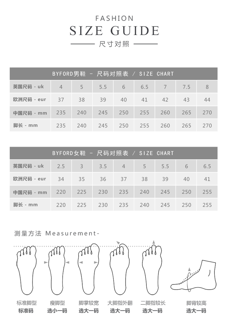 简介:鞋子的尺码(Shoes Size),又叫鞋号,常见有以下标法:国际、欧洲、美国和英国。国际标准鞋号表示的是脚长的