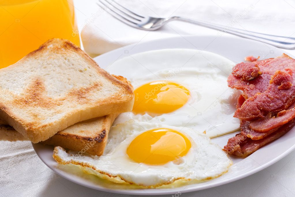 与培根煎鸡蛋和番茄烤面包和咖啡