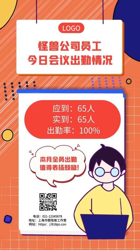 橙色卡通公司员工出勤率汇报手机竖版海报