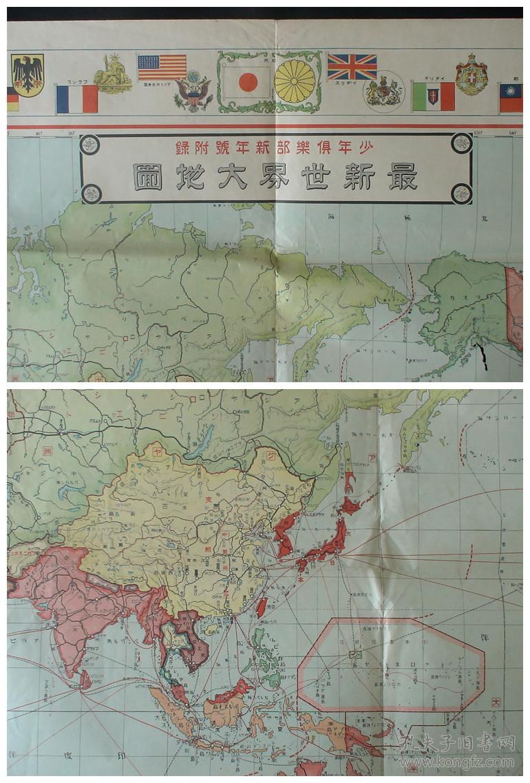 【】1931年侵华老地图!《最新世界大地图》 (中华国民政府-青天白日旗、苏联-镰刀斧头国旗、世界各国国旗及纹章!台湾、关东州及朝鲜、南库页岛被划入日本版图!钓鱼岛识别区-东支那海!南海领权!)特大版幅!珍稀 民国老地图!