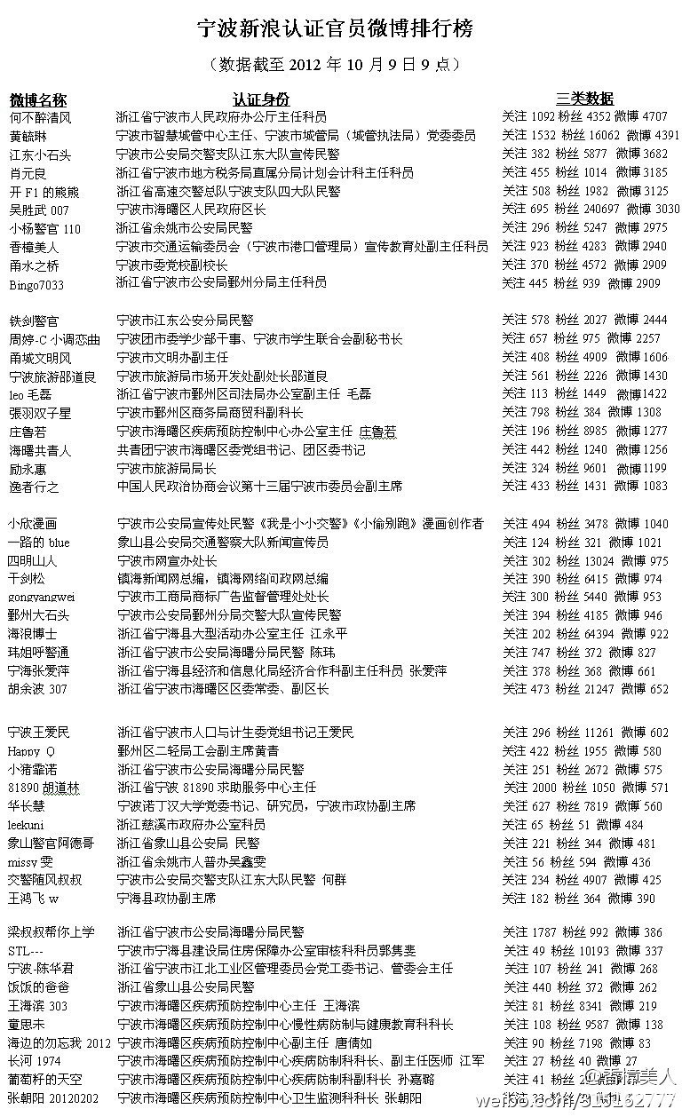 宁波新浪认证官员微博排行榜