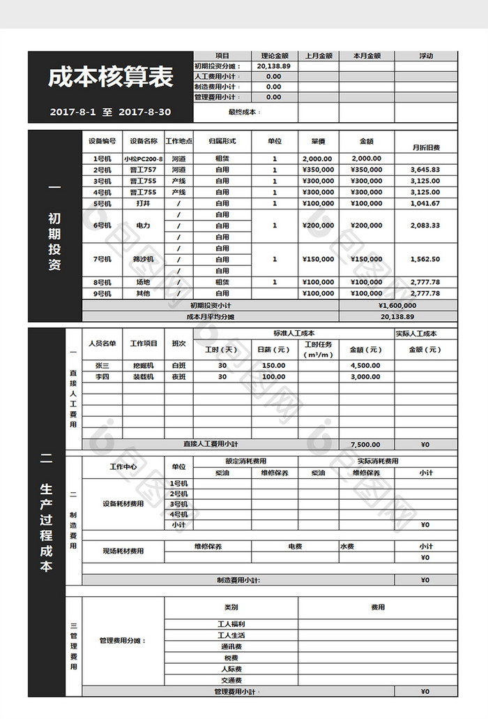 成本核算excel表格模版