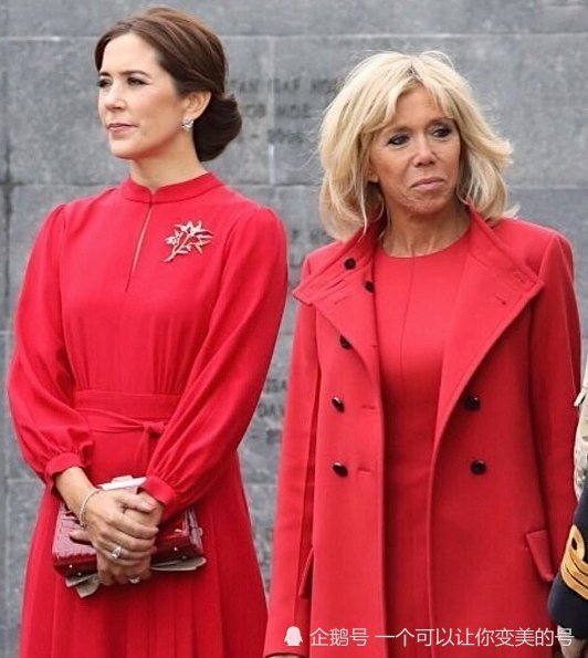 马克龙夫人与丹麦王储妃穿中国红,玛丽一