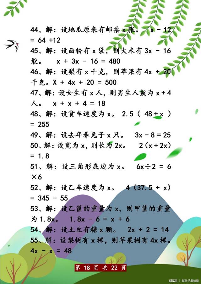 五年级上册数学:100道解方程应用题