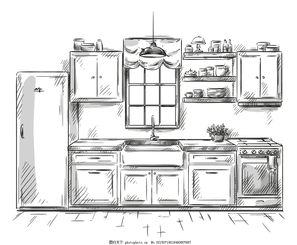 黑白手绘家具厨柜插画