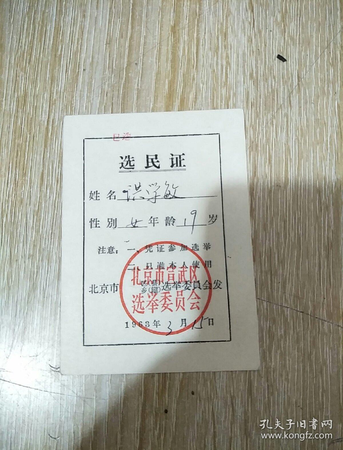 1963选民证 洪学敏 两张合售