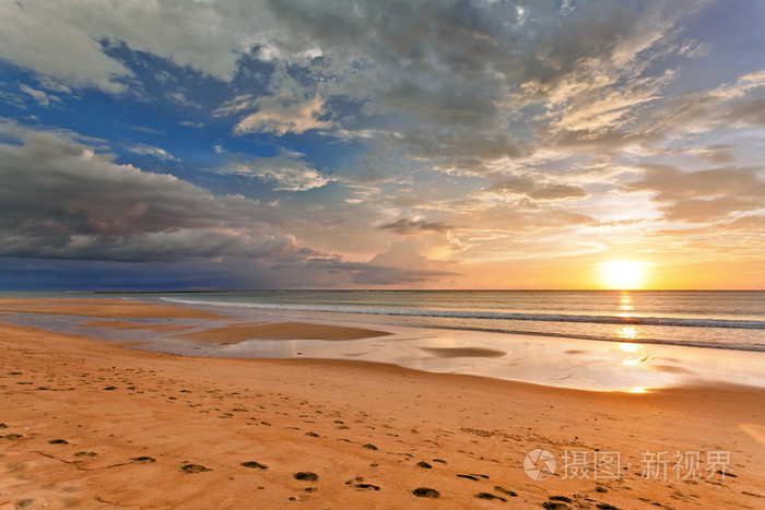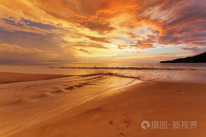 在退潮时间日落背景上的热带海滩