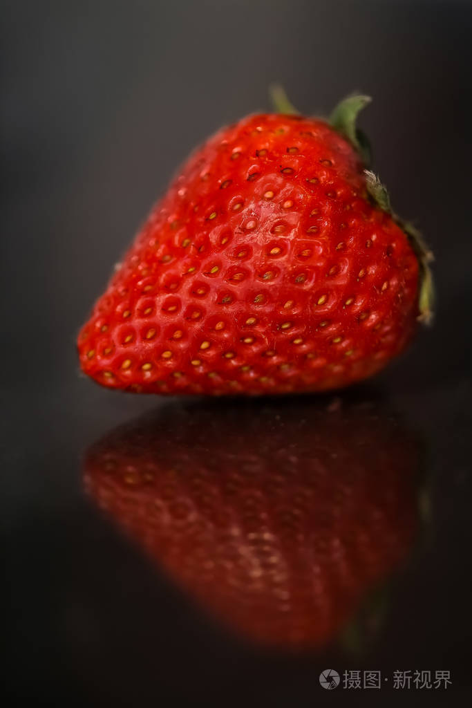 红色的草莓,黑色有光泽背景与反射