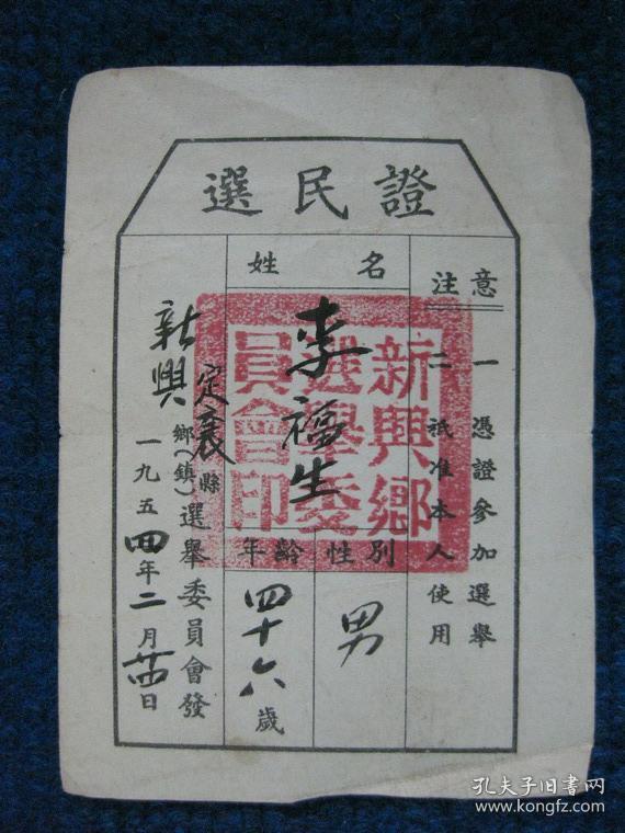 1954年选民证(繁体、定襄县新兴乡)
