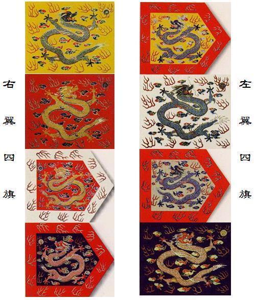 清朝历代八旗旗主- 答:满清八旗:镶黄、正黄、正白、正红、镶红、正蓝、镶蓝、镶红。 八旗中正四旗龙首向右,龙腹内5朵祥云,镶四旗龙首向左,龙腹内3朵祥云。黄旗配蓝龙,白旗配蓝龙,红旗配黄龙