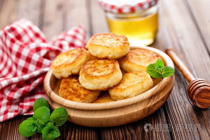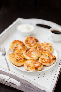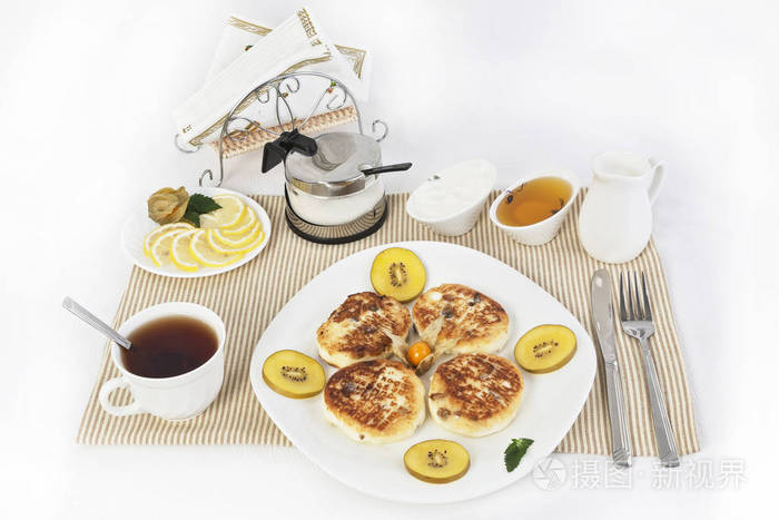 豆腐煎饼加蜂蜜和酸奶油的茶。这是一个很