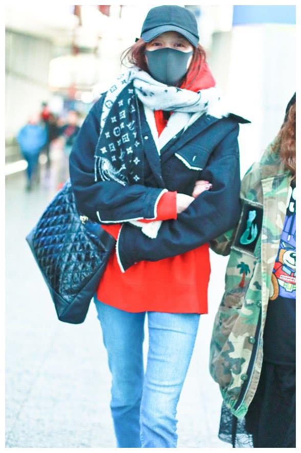 关晓彤穿红色卫衣搭配超短外套,时尚感