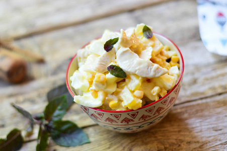 节日沙拉配鸡胸肉、 奶酪、 甜玉米、 菠萝