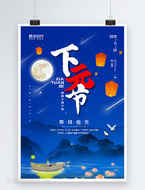 简介:下元节,中国传统节日,为农历十月十五,亦称"下元日"、"下元"。是中国民间传统节日之一。正月十五中国