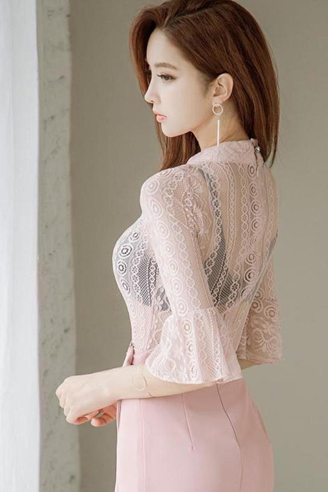 朴洙妍深绿色镂空雕花抹胸连衣裙, 珠圆玉润~