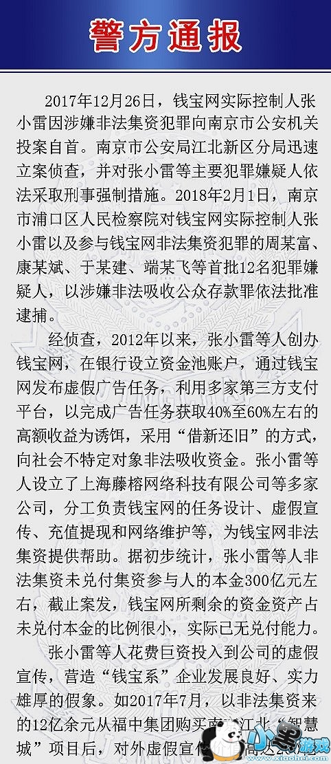钱宝网案最新进展:张小雷涉集资诈骗 检察