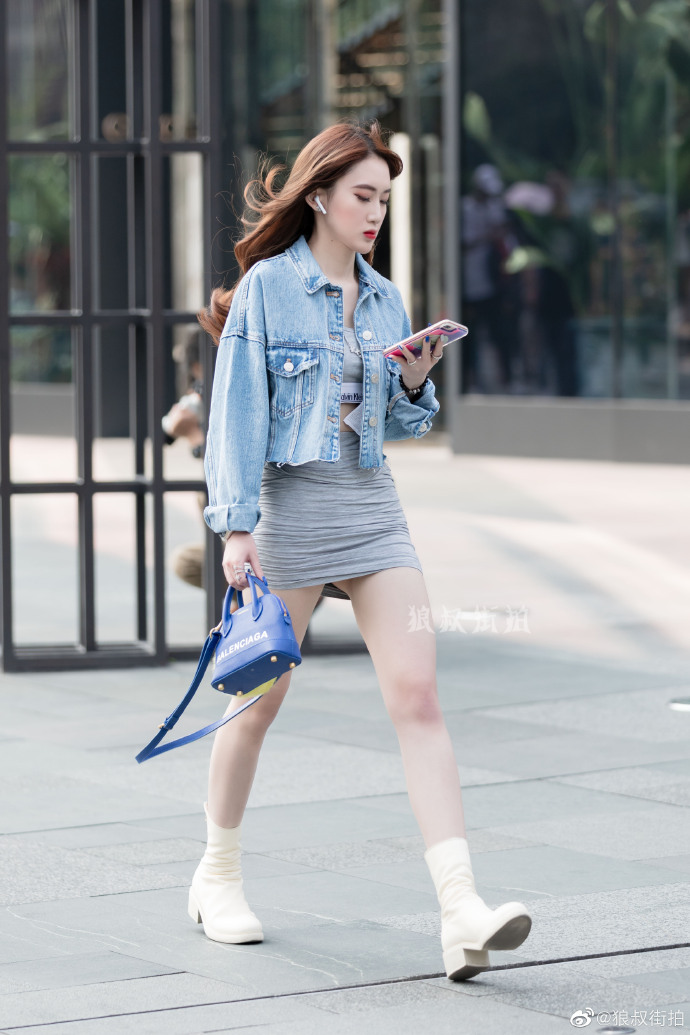 街拍:超短褶裙加牛仔外套的搭配|短褶裙|