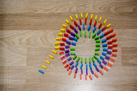 丰富多彩的多米诺骨牌块,在白色背景上的一条线