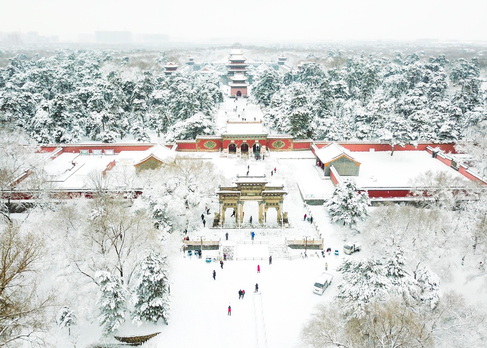 航拍雪后沈阳北陵 树影婆娑如水墨画