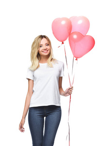 微笑可爱男孩与捆绑气球被隔绝在白色