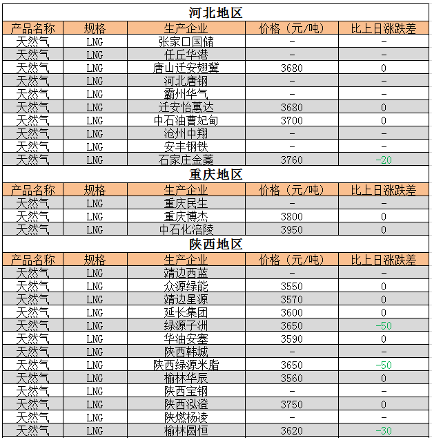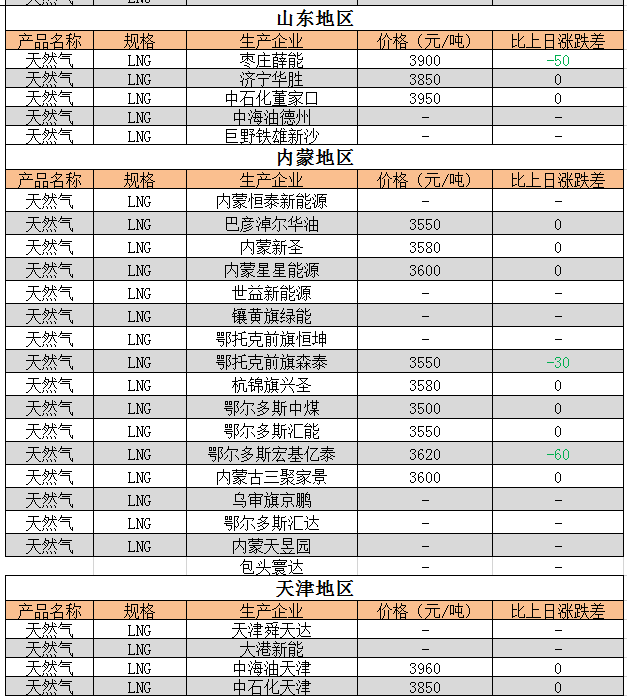 近期天然气LNG出厂价格追踪