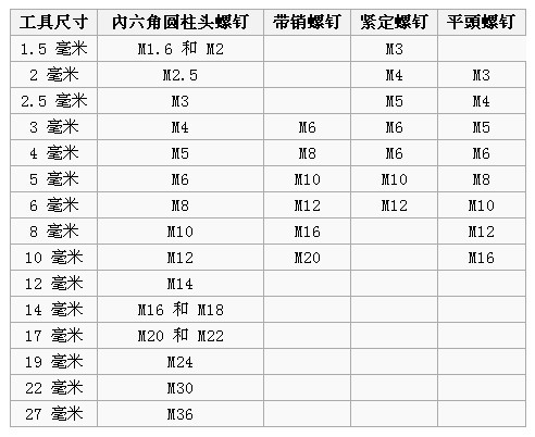 公制内六角扳手配套使用之螺丝尺寸对照表