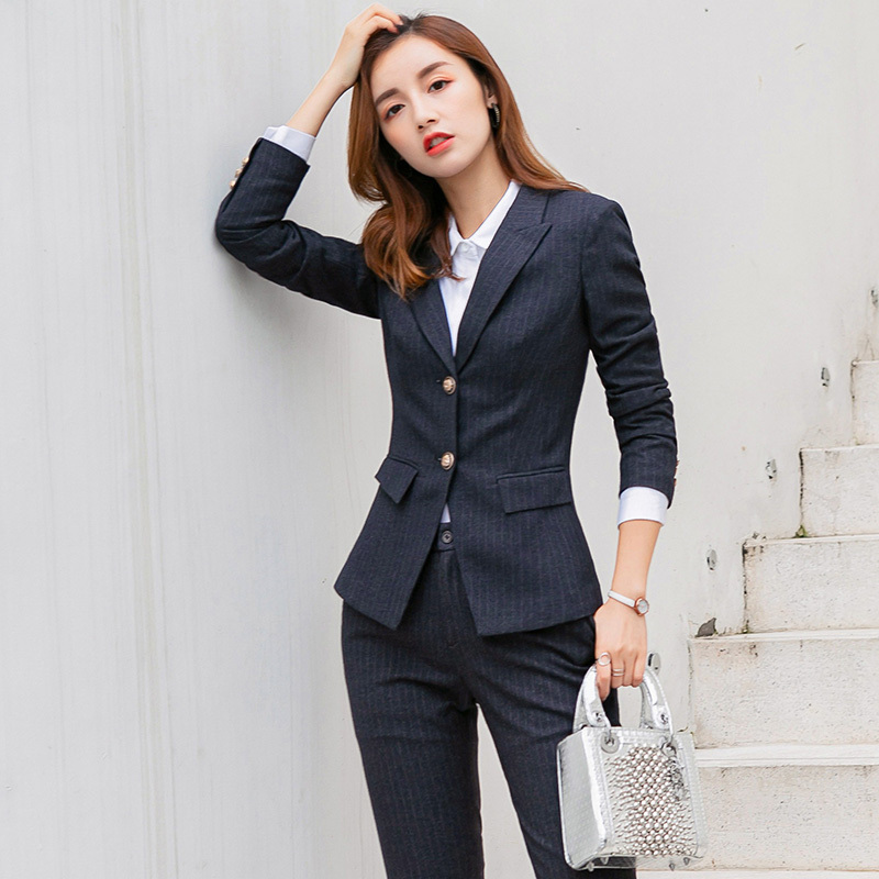 辉铭武韩版条纹西服职业女装套装秋冬白领商务OL通勤修身办公工作服面试