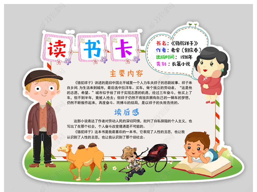 骆驼祥子读书卡通用模板DIY好书推荐卡