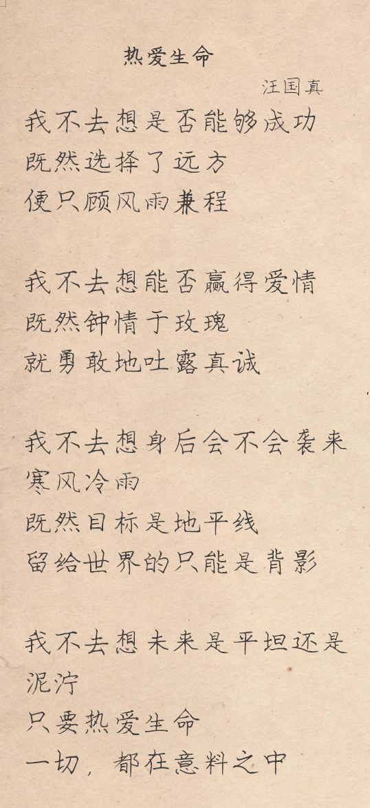 简介:《热爱生命》是现代诗人汪国真创作的诗歌,是一首富含励志色彩的抒情体新诗。此诗以成功、爱情、奋斗和未