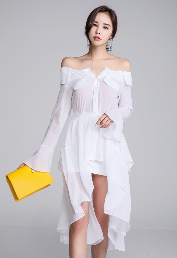 白衬衫不规则下摆连衣裙,若隐若现的质感,