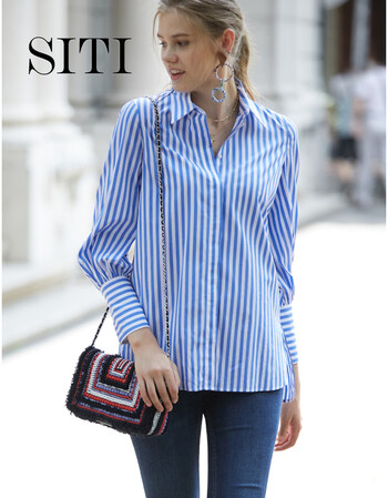 蓝白条纹纯棉长袖衬衫下摆开叉职业通勤