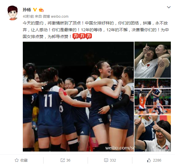孙杨点赞女排拼搏精神:好样的!决赛看你们