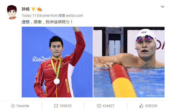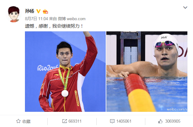 孙杨微博致意网友:遗憾 感谢你们我会继续