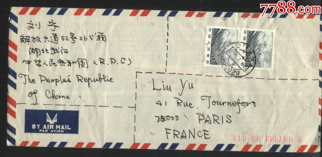 198?年航空封(湖北武汉--法国巴黎)(邮编戳)