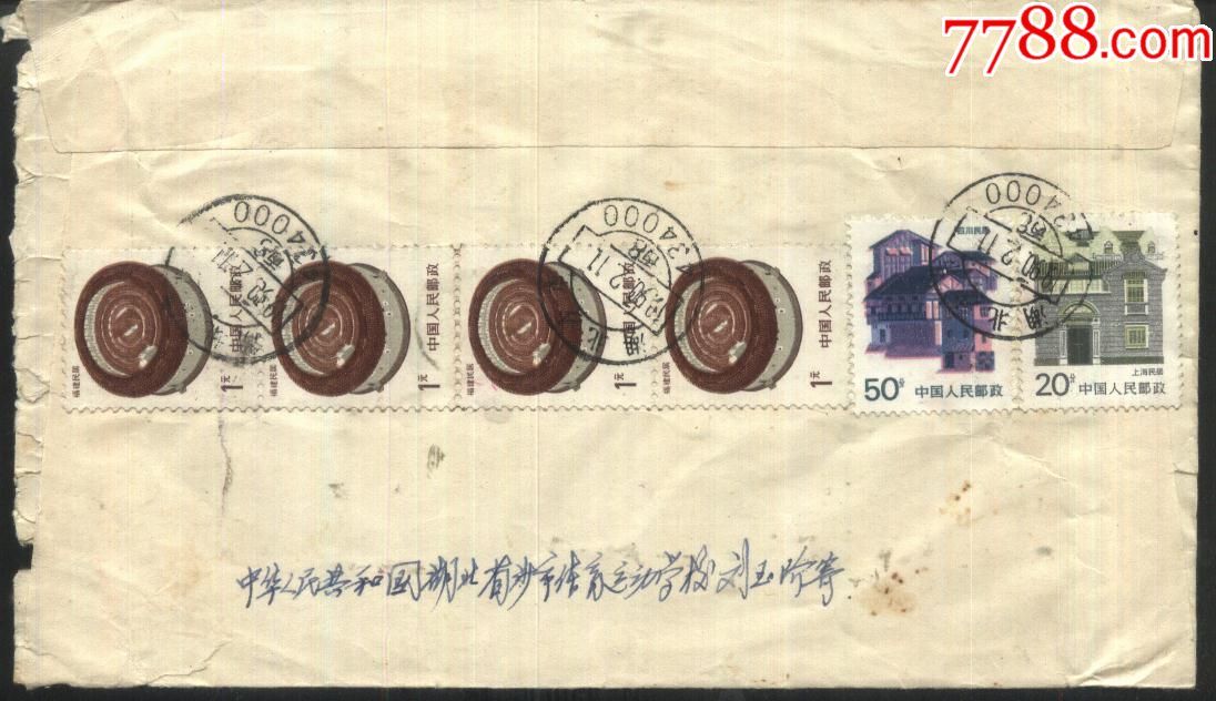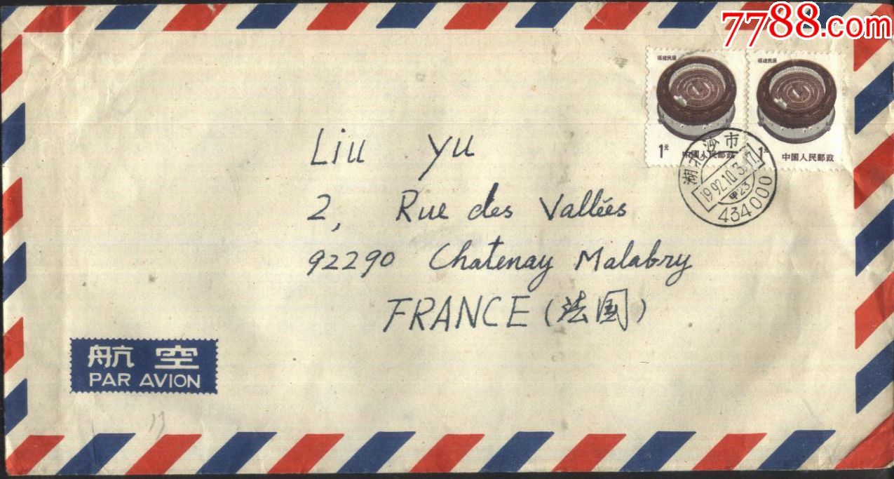 1991年实寄封(法国--沙市)湖北沙市邮编