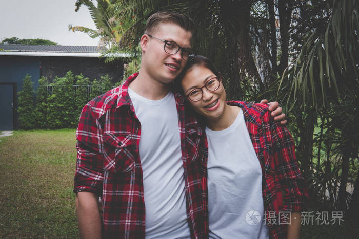 相爱的情侣站着互相拥抱。男朋友和女孩