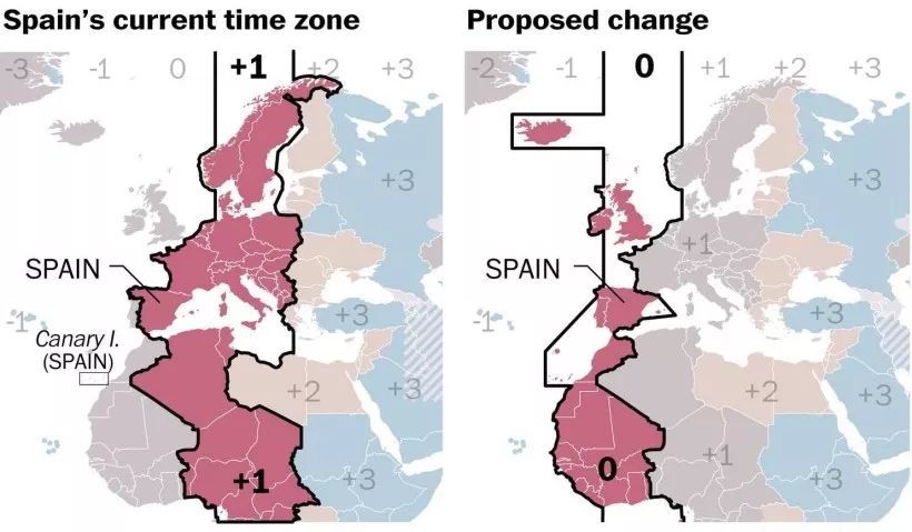 简介:西班牙时区跨UTC-1和UTC两个时区,但是使用UTC+1为标准时间。