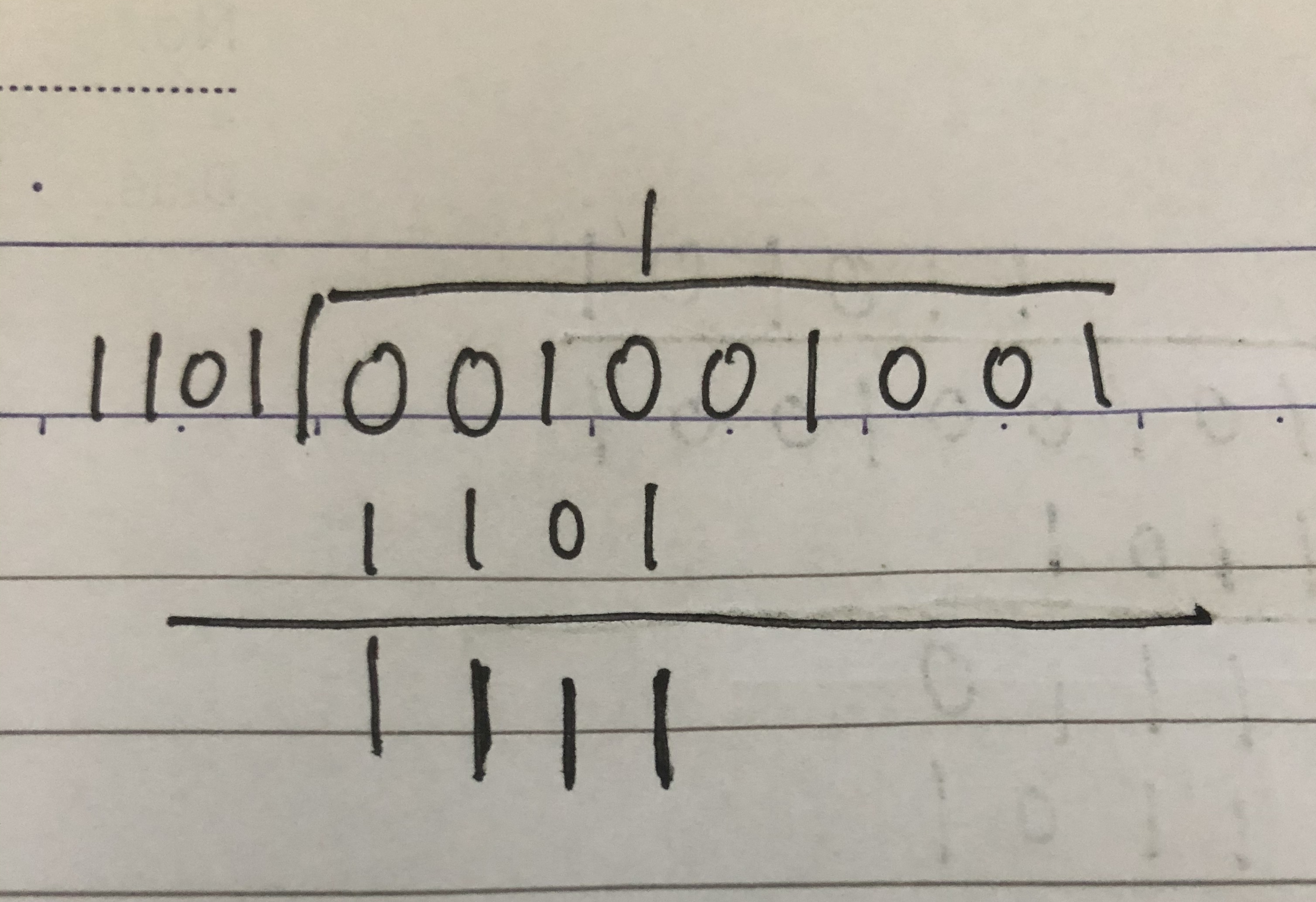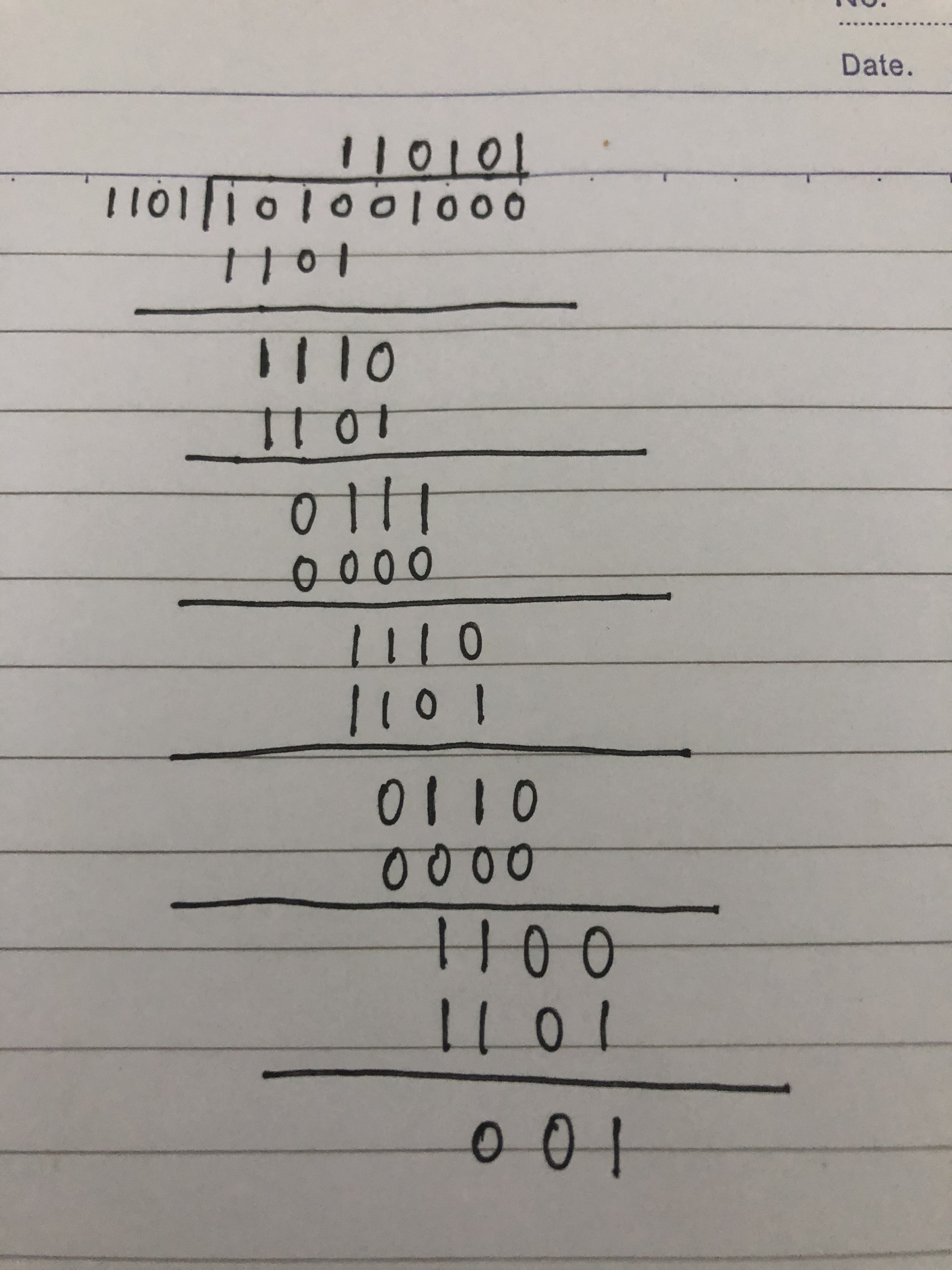 答: CRC里的除法不是简单的二进制除法,不信用附件里的计算器算出的结果与它的结果不一样。 CRC的二进制除法是这样的: 1111000 被除数 1101 除数 ———— 够除数