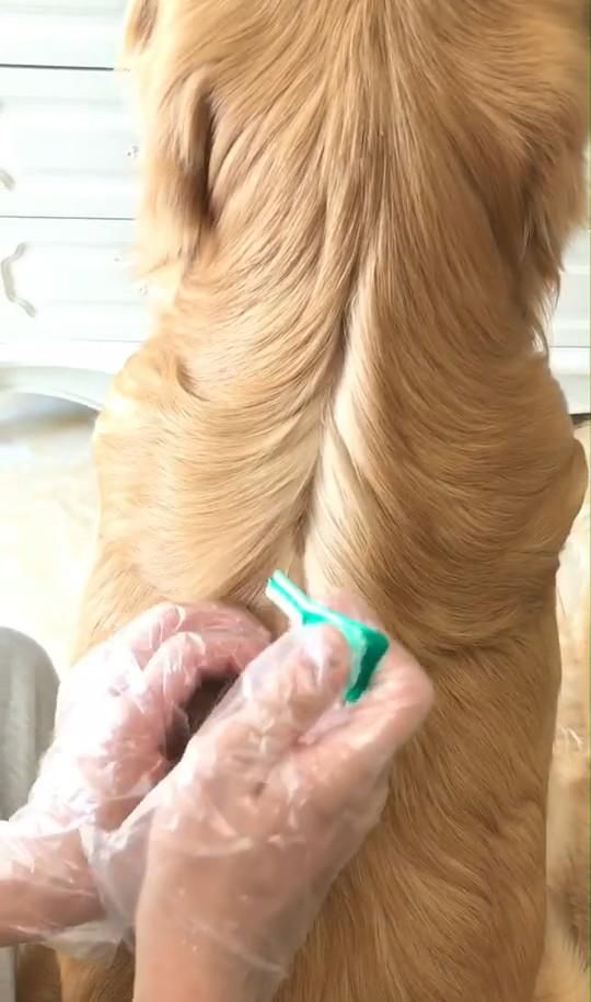 主人耐心帮金毛除驱虫,金毛老老实实呆坐,