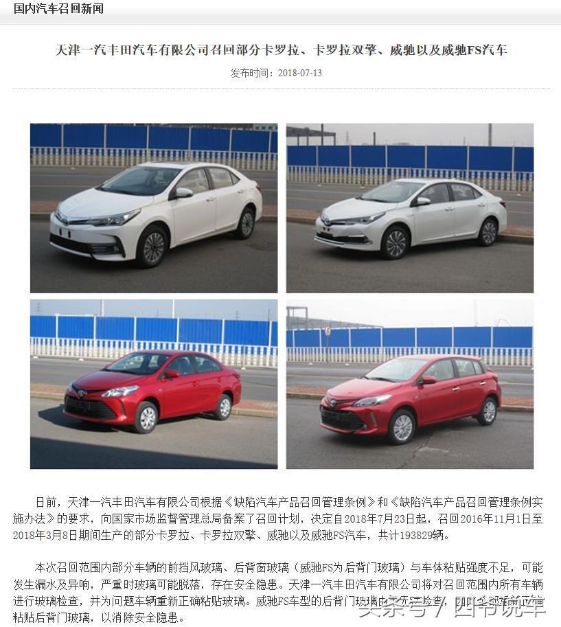 一汽丰田召回卡罗拉威驰超19万辆:玻璃存
