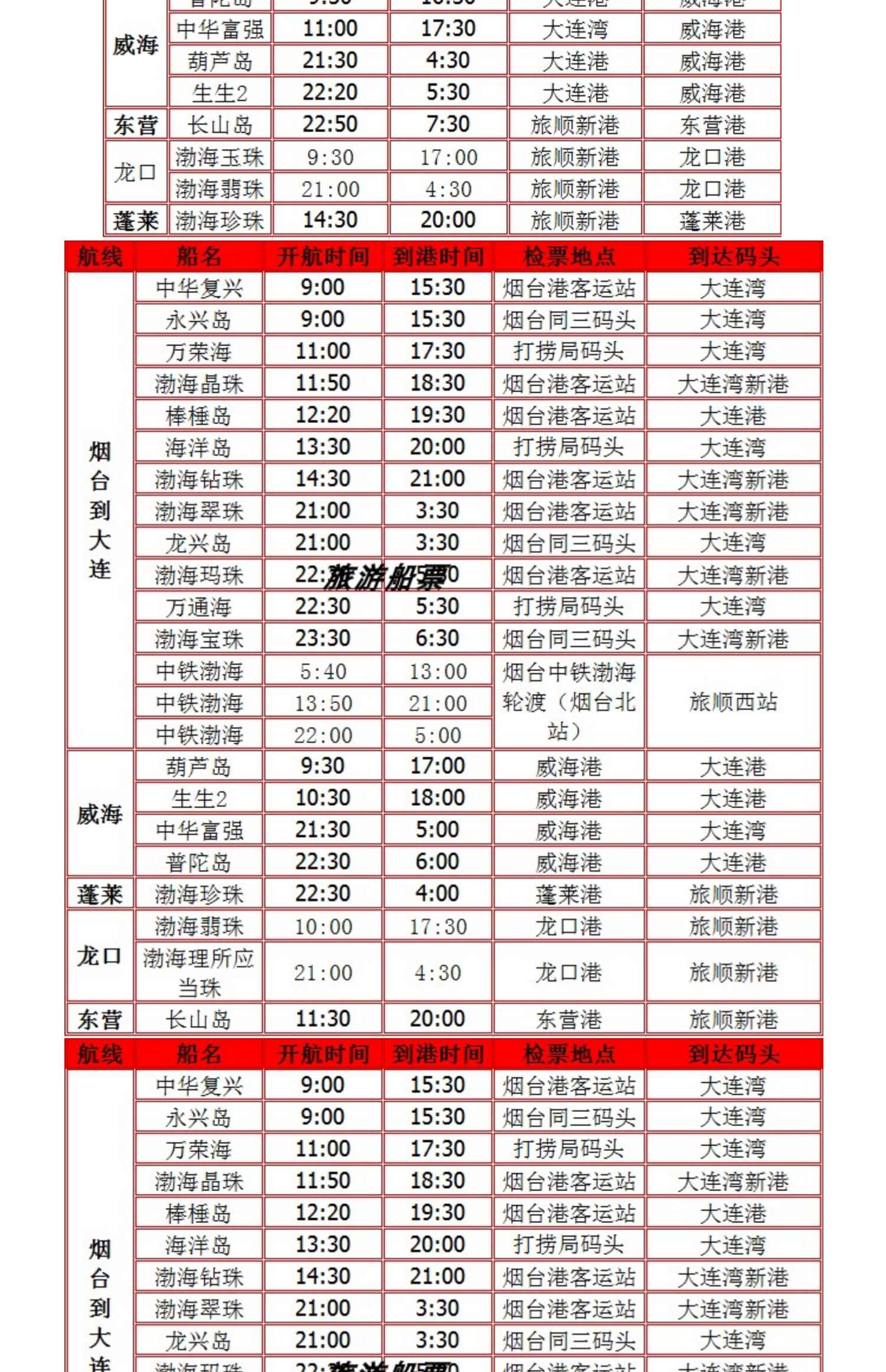 答:每日 发船时间 烟台 大连 天淮 (单日) / 天江(双日) 7:50 烟台 大连 海洋岛 21:30 大连 烟台 海洋岛 12:00 大连 烟台 天淮 (单日) / 天江(双日) 20:00 烟台 大连 长兴