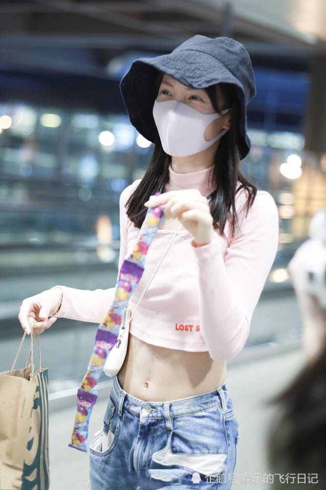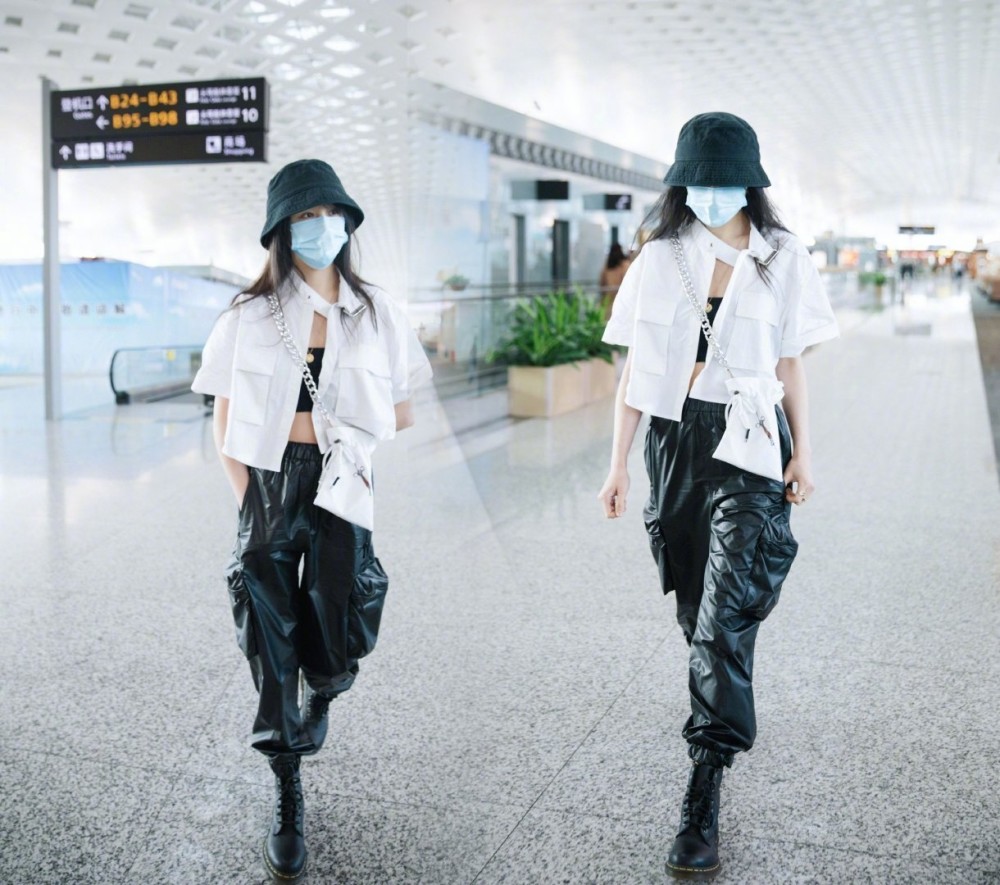 郑爽最新机场造型变身酷女孩,露脐装配